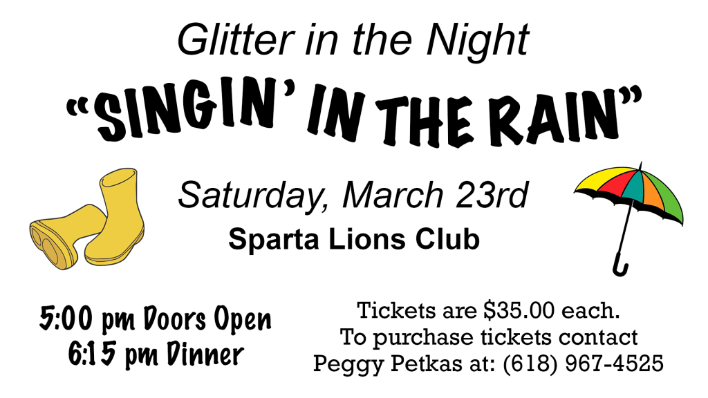Tickets for the Glitter in the Night Auction and Dinner are now on sale! Tickets are $35.00 each. To purchase tickets, please contact Peggy Petkas at: (618) 967-4525. Glitter in the Night will be held on Saturday, March 23rd at the Sparta Lions Club. The theme this year is “Singin’ in the Rain” and dinner will be catered by Seasons Event Center. The doors will open at 5:00 p.m. and dinner will be served at 6:15 p.m. The Friends of the Library are still collecting monetary donations and auction items for the fundraiser. Please plan on joining us for a fun night supporting the Library!